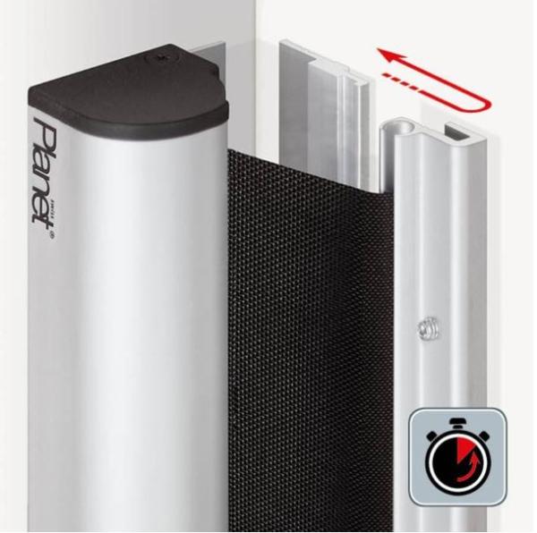 Planet Fingerschutz-Rollo FSR 6000 [Quick] zur Sicherung der Bandgegenseite an der Nebenschließkante von Drehflügeltüren. Automatisch auf konstante Spannung ziehendes Schutzrollo.