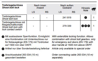 Die Selbstverriegelung schließt nach dem Zuziehen des Gangflügels automatisch den Fallenriegel auf 20 mm vor. Entriegeln von außen immer mit dem Schlüssel, Entriegeln von innen jederzeit über die Bedienelemente möglich (Gang- oder Standflügel). Nach Betätigung des Bedienelementes am Standflügel sind die Treibstangen eingezogen und gleichzeitig der Gangflügel entriegelt.